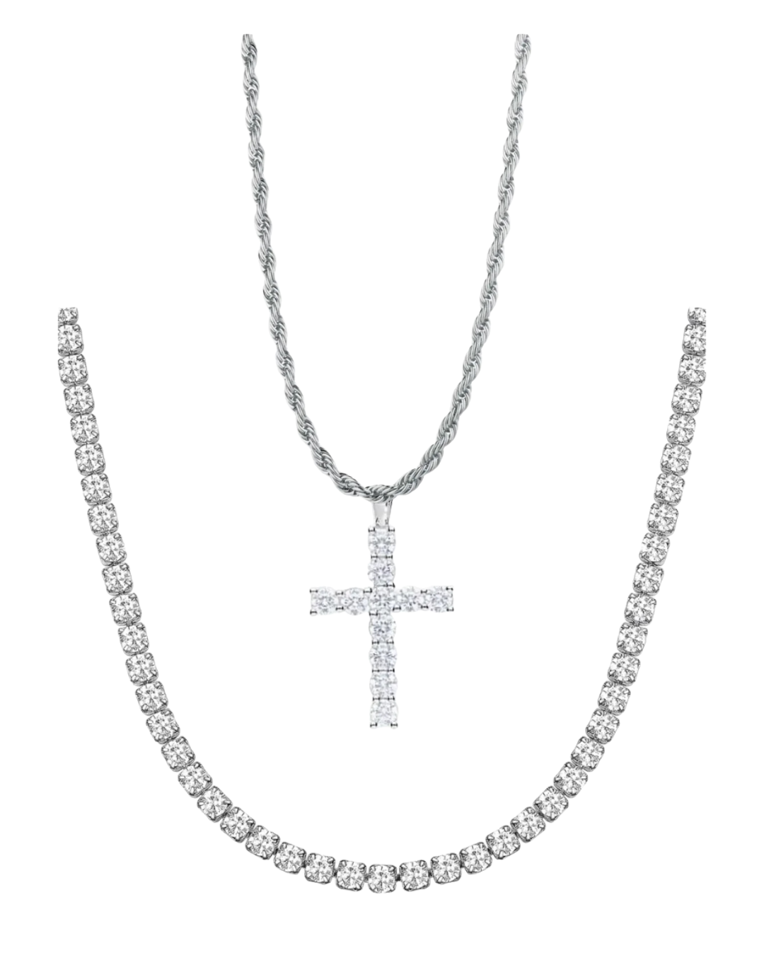 COLLANA TENNIS SILVER + COLLANA ROPE + CROCE (ACCIAIO INOSSIDABILE)