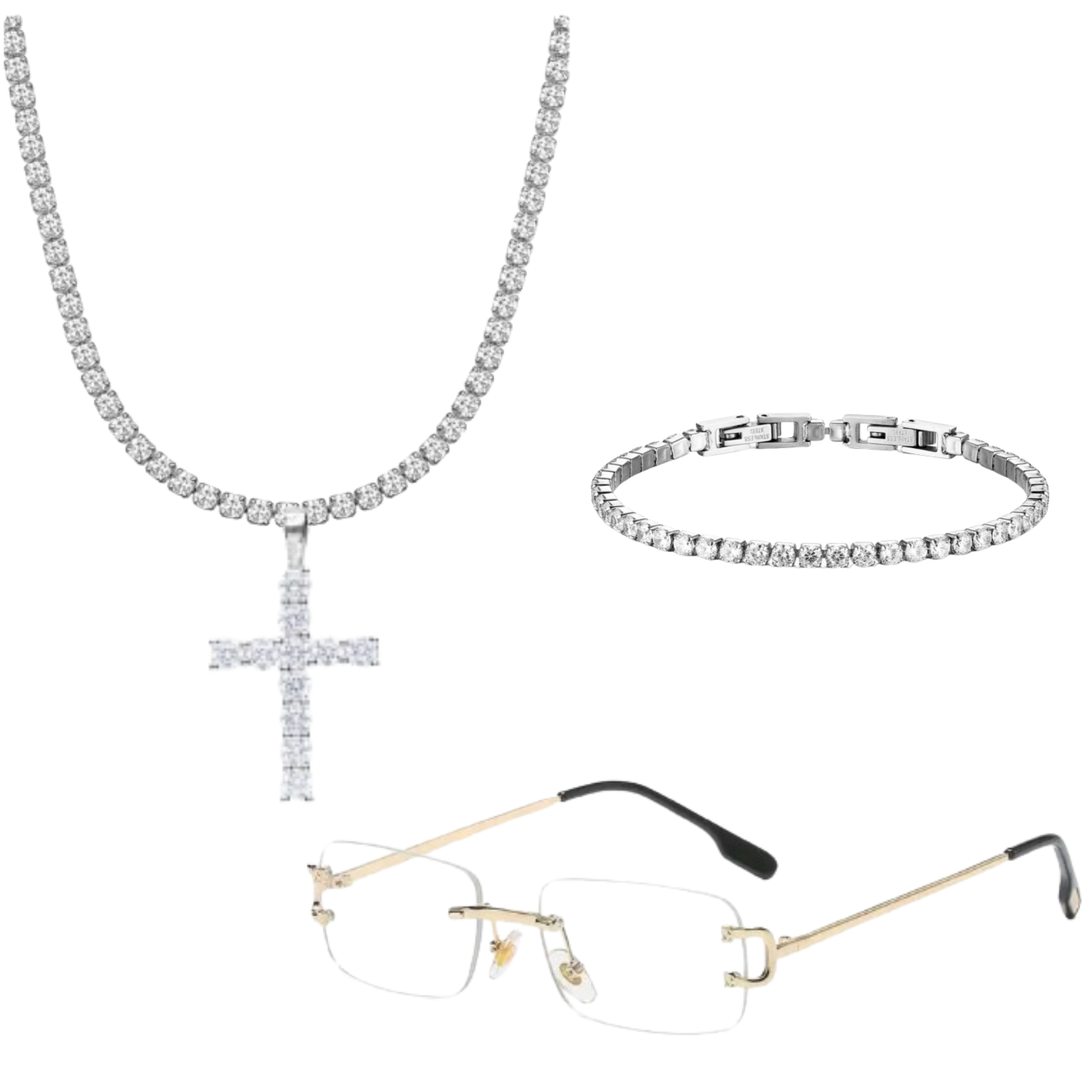 Collana tennis + Croce, Occhiali “Miami”, bracciale tennis (Acciaio inossidabile)
